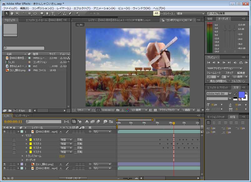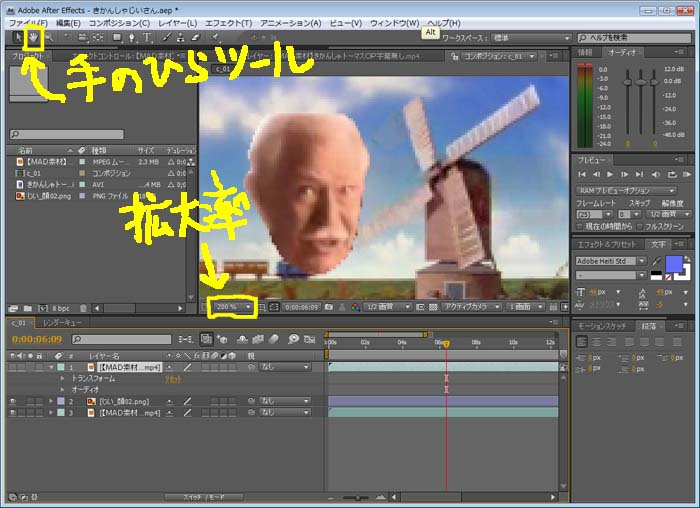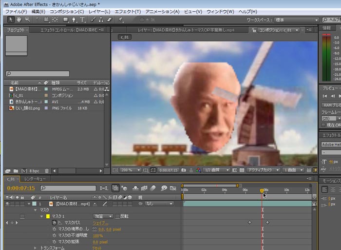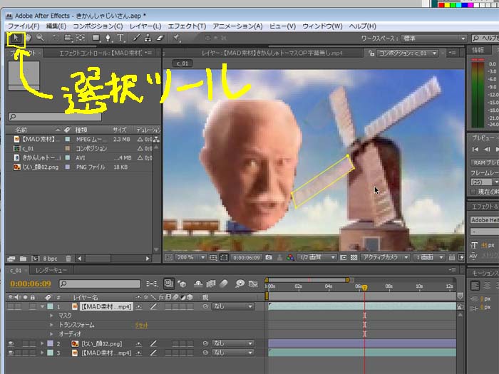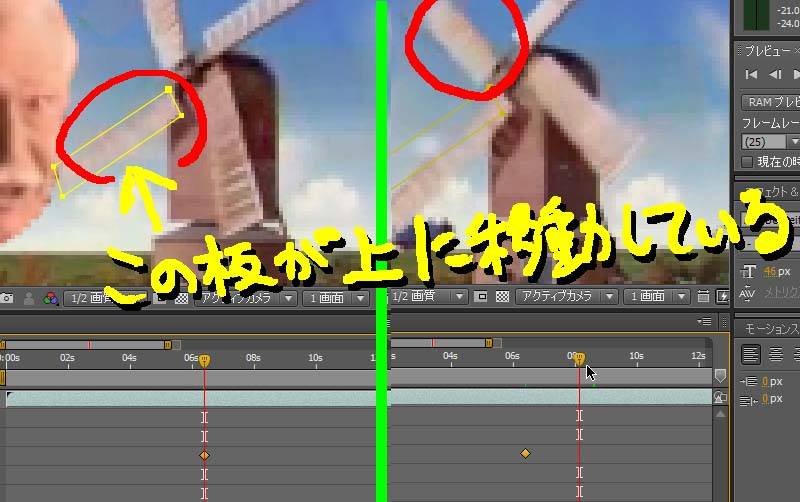 今回は動画の風車をマスクで切り抜き、顔が風車の下にいくようにします。